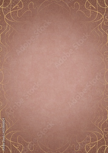 Pale pink textured paper with vignette of golden hand-drawn pattern and golden glittery splatter on a darker background color. Copy space. Digital artwork, A4. (pattern: p02-1d)