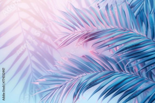 Palm leaves, summer background with gradient color, pastel blue and pink colors, tropical leaf pattern Generative AI