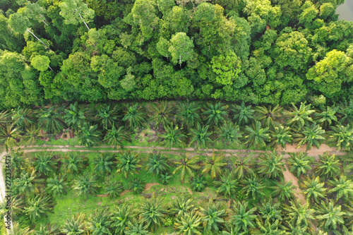 Palm oil plantation at rainforest edge. Deforestation in Malaysia destroys rain forest for oil palms