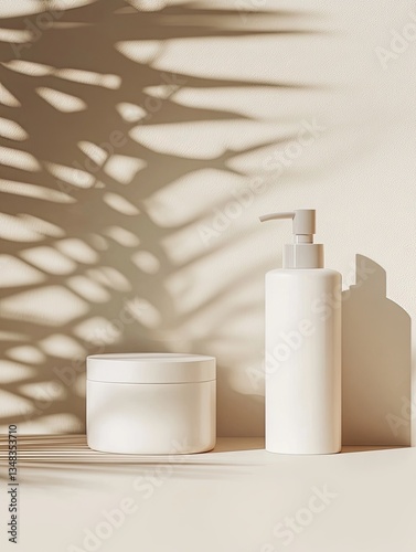 skincare, product, beauty, cosmetic, cream, lotion, jar, bottle, pump, dispenser, cardboard box, design, shadow, palm leaf, tropical, summer, sunlight, minimalist, clean, simple, elegant, spa, wellness, natural, organic, texture, background, branding, advertising, marketing, promotion, commercial, photo, image, illustration, template, mock-up, studio shot, still life, beauty product