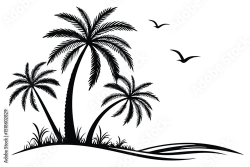 palm, tree, beach, tropical, vector, summer, sea, island, nature, illustration, silhouette, sun, travel, landscape, design, sky, ocean, vacation, sunset, palm, leaf, paradise, holiday, banner, water