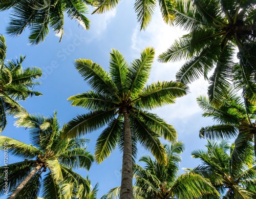palm, tree, sky, blue, green, tropical, lush, coconut, nature, sunlight, leaf, frond, tall, dense, vegetation, view, upward, growth, abundant, panorama, full, bright, summer, paradise, relaxing, holiday, beach