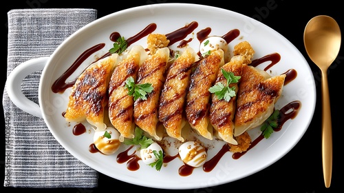 Pan Fried Gyoza Dumplings with Sesame Seeds Soy Glaze and Creamy Mozzarella Garnish