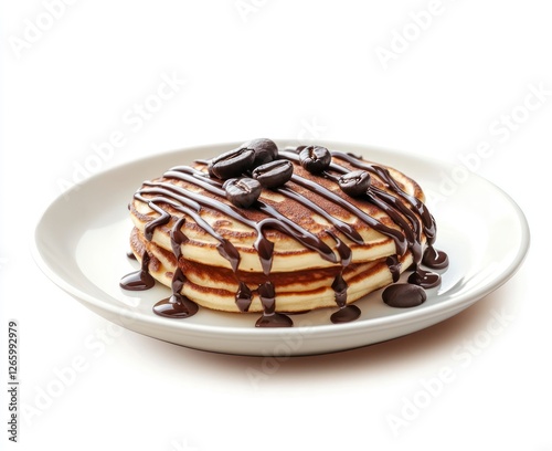 Pancake with chocolate drizzle and coffee beans, isolated on a white background. A photorealistic picture, shiny chocolate drizzle over it, isolated on a white background