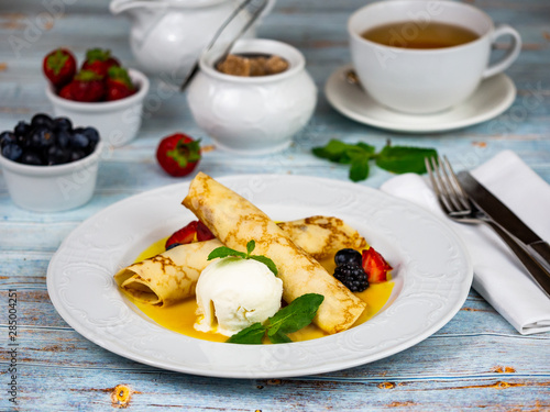 Pancakes with a scoop of ice cream. Restaurant serving.