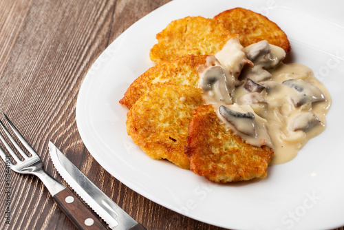 Pancakes with fried mushrooms and onions. Potato pancakes with mushrooms and sour cream. Ukrainian cuisine, European cuisine