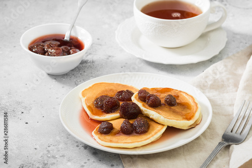 food, breakfast, hot drink, cup, sweet, dessert, cake, tea, drink, bread, plate, meal, baked, white, cheese, snack, delicious, morning, pastry, pie, lunch, apple, sugar, healthy, battercake, honey, knife, fork, cutlery, white plate, napkin, table, muffin, jam, strawberry, berry, dough, cafes, baking, bakery, cappuccino, grey background