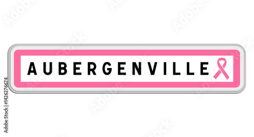 Panneau de sortie d'Aubergenville, Yvelines, Île-de-France avec Ruban Octobre Rose