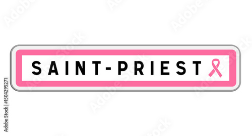 Panneau d'entrée de Saint-Priest, Métropole de Lyon, Auvergne-Rhône-Alpes avec Ruban Octobre Rose