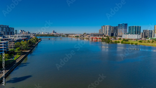 Panorama Aerial view above Rhodes with views to Meadowbank and Olympic park and Wentworth Point and Concord West with Parramatta River in Sydney NSW Australia