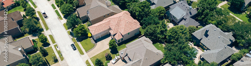 Panorama aerial view colorful concrete roof tiles row of large two-story single-family houses swimming pools in upscale residential area Coppell, suburbs Dallas Fort Worth, well-trimmed lawn