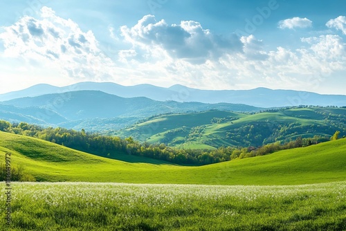 panorama of beautiful countryside of romania. sunny afternoon. wonderful springtime landscape in mountains. grassy field and rolling hills. rural scenery