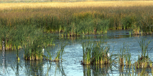 Panorama of two Snowy Egrets in blue water in the marsh at Alamosa National Wildlife Refuge in Colorado