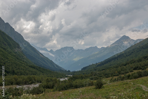 Panorama view on mountains with river scene in national park of Dombay