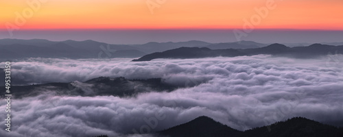 Panorama with amazing sunrise. Landscape with high mountains. Touristic place Carpathian national park, Ukraine Europe. Natural scenery.
