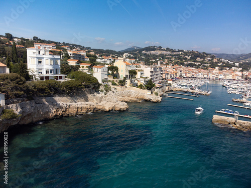 Panoramic aerial view on cliffs, blue sea, beach, houses, streets and old fisherman's harbour with lighthouse in Cassis, Provence, France