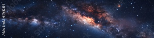 Panoramic astrophotography of visible Milky Way galaxy. Stars, nebula and stardust at night sky
