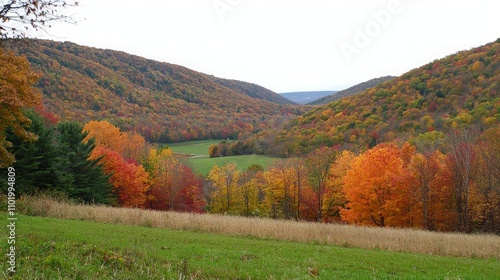 Panoramic autumn valley view, vibrant fall foliage, hills, trees, meadow.