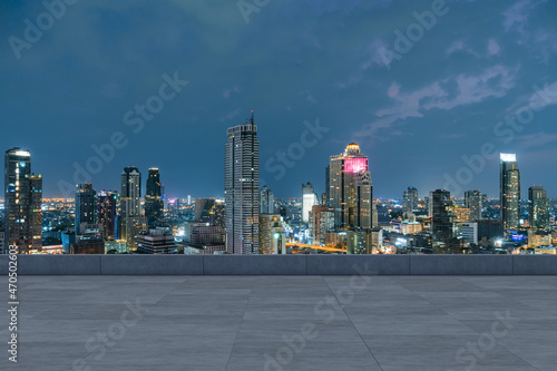 Panoramic Bangkok skyline view, concrete observatory deck on rooftop, night time. Asian corporate and residential lifestyle. Financial city downtown, real estate. Product display mockup empty roof