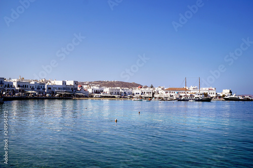 Panoramic day view of the old port of Chora in Mykonos