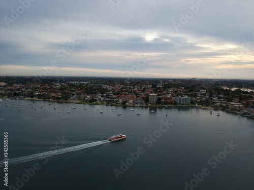 Panoramic drone aerial view over Sydney harbour on a cloudy sunset showing the nice colours of the harbour foreshore