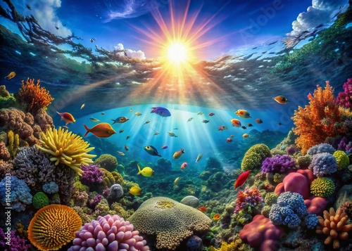 underwater, ocean, sea, coral reef, fish, marine life, vibrant, colourful, detailed, hi-res, photorealistic, surreal, fantasy, sunlight, lighting, dramatic, breathtaking, magical, texture, wildlife, nature, photo, image, picture, photo, visual, art, beautiful, stunning, view, scene, perspective, fisheye, ball-shaped