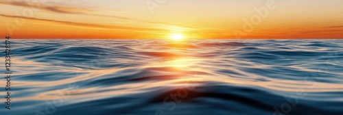 Panoramic ocean sunset, golden hour sky, vibrant orange and pink clouds, calm sea surface, sun reflection on water, tranquil seascape, horizon view, dramatic lighting, photorealistic, high resolution,