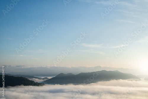 Panoramic of foggy at morning, Mountains top view of sunrise landscape in the rainforest, Thailand.