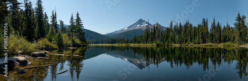 Panoramic photo of Lake. The lake is clear and calm, reflecting the surrounding mountains and trees in its surface. In front of it stands Mount Hood with snow-capped peaks against a blue sky backgroun