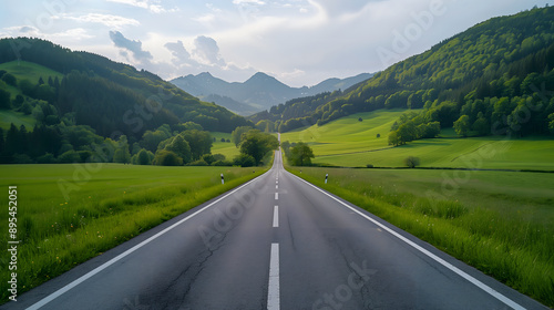 Panoramic road landscape among green mountains. View of asphalt road in beautiful nature landscape. Road view in the beautiful nature of Europe. Bavaria, Germany.