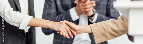 panoramic shot of colleagues in formal wear shaking hands in conference hall
