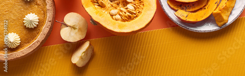 panoramic shot of pumpkin pie with whipped cream near raw and baked pumpkins, cut apples, and textured napkin on orange surface
