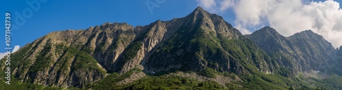 Panoramic shot of stunning mountain range with rugged peaks and lush greenery, blue sky with clouds, forest, alpine landscape. Tonale Pass, Italy. Summer vacation. Dolomite Alps. Ecology concept