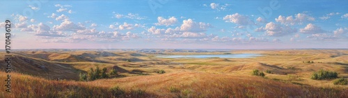 panoramic, landscape, prairie, hill, lake, cloud, sky, sunny, gold, autumn, nature, scenic, elevated, view, tranquil, huge, open, gentle, warm, daylight, colours, rich, detailed, dry, dune, rolling, outdoors, expansive, serene, misty, peaceful, rural, picturesque, painted, art, impressionistic, natural, summer