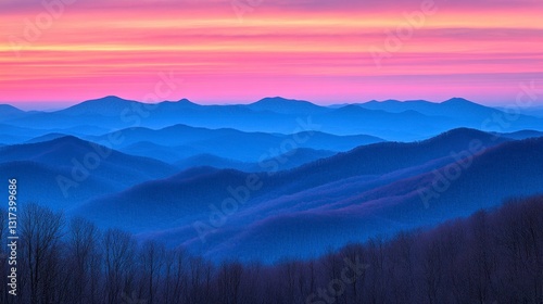 Panoramic view of a mountain range at sunrise, showcasing layers of blue and purple hues against a vibrant pink and orange sky. The image features a serene and peaceful atmosphere.
