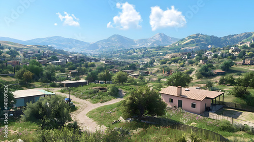 village, mountain, landscape, house, tree, sunny, day, nature, green, brown, light, rural, hill, vale, exterior, view, scenic, town, countryside, idylli, peaceful, vacation, travel, exploration, summer, spring, road, path, vegetation, flora, foliage, calm, tranquil, hillside, building, architecture, pastel, mediterranean, home, scenery