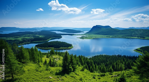Panoramic view of a serene lake surrounded by lush green forests and mountains. Concept of nature, tranquility, and scenic beauty.