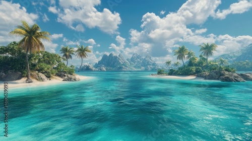Panoramic view of a tropical island paradise with turquoise water and white sandy beaches