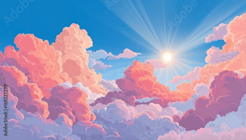 sky, cloud, colourful, sunrise, sunset, panorama, vibrant, pastel, pink, orange, light, sun, ray, cumulus, fluffy, artistic, digital, illustration, graphic, design, nature, beautiful, scenic, view, horizon, atmosphere, bright, warm, blithe, detailed, soft, gentle, huge, expansive, airy, high, perspective, radiant, sunny, day, morning, afternoon, summer, spring, art, digital artwork, cloudscape