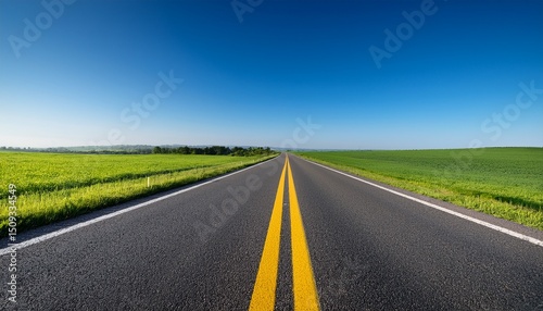 panoramic view of a well maintained blacktop road with double yellow lines stretching through vibrant green fields under a clear blue sky