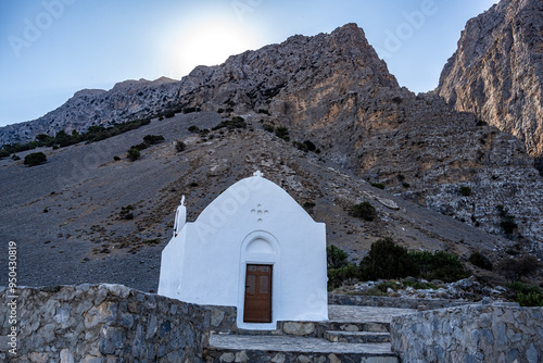 panoramic view of ancient buildings against the backdrop of nature and mountain gardens on a sunny day on the island of Crete in Greece