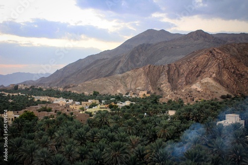 Panoramic view of Birkat Al Mouz and old abandoned village, Oman
