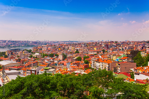 Panoramic view of Istanbul. Panorama cityscape of famous tourist destination Golden Horn bay part of Bosphorus strait. Travel landscape Bosporus, Turkey, Europe and Asia.
