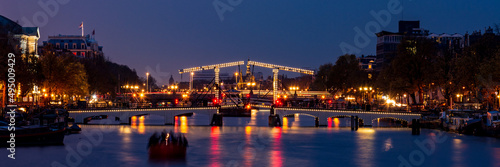 Panoramic view of Magere Brug (English: Skinny Bridge) at night, Amsterdam, the Netherlands.