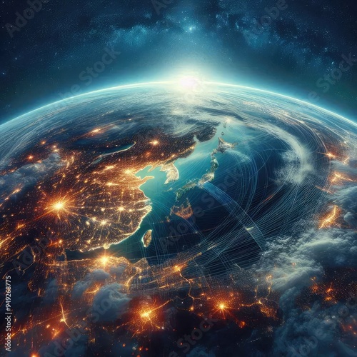 Panoramic view of planet Earth globe atmosphere from space with Glowing city lights infrastructure