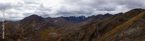 Panoramic View of Scenic Landscape and Mountains on a Cloudy Fall Day in Canadian Nature. Taken in Tombstone Territorial Park, Yukon, Canada.