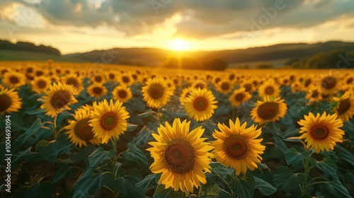 Panoramic View of Sunflower Field at Sunrise - Golden Blooms, Vibrant Morning Light, Serene Summer Landscape, Idyllic Nature Scene for Wallpaper or Background