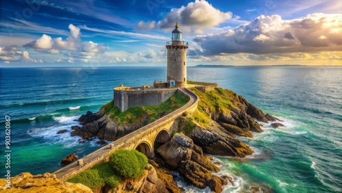 Panoramic view of the iconic Le Petit Minou lighthouse in Brittany, France, scenic, landscape, seascape, ocean