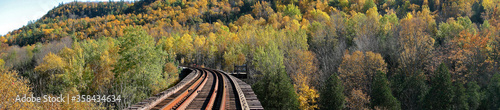 Panoramic view of the vibrant autumn colors with railroad track at Credit River Valley in Celedon, Ontario, Canada.
