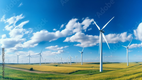 Panoramic view of wind farm or wind park, with high wind turbines for generation electricity with copy space. Green energy concept. Generative AI